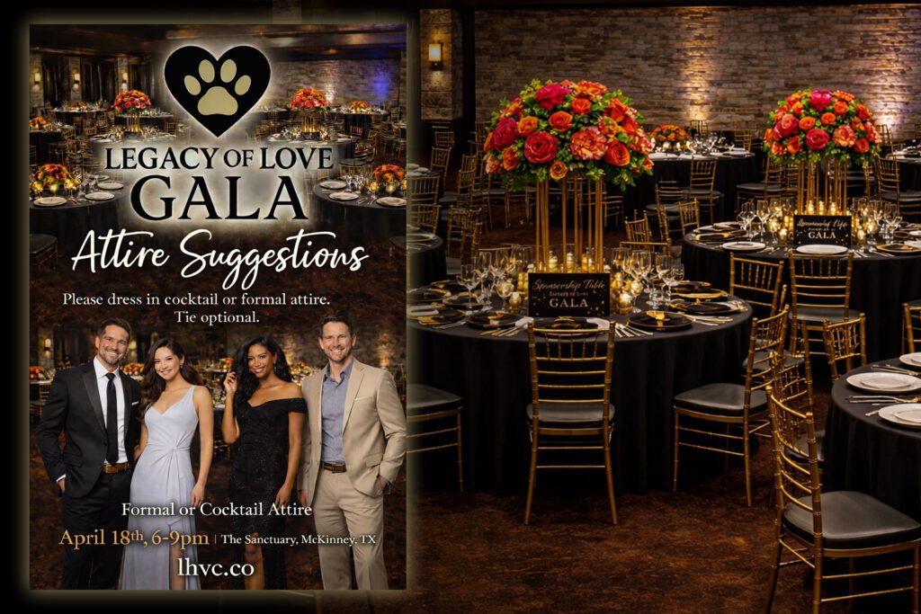 Join Legacy Humane Society from 6:00pm–9:00pm on Saturday, April 18th, 2026, for the Legacy of Love Gala at The Sanctuary, Adriatica Village, McKinney, TX.